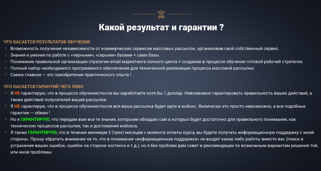 О результатах написано в разделе ``Какие результат и гарантии``. Другими словами, все зависит от самих ваших целей обучения и непосредственно того, как ВЫ будете работать и выполнять задания. Все уроки предоставляются в формате видео, где я наглядно на примере демонстрирую все действия. Вам нужно лишь немного подумать и повторить за мной. Кроме того, у вас есть право на информационную поддержку в течении 3х месяцев с момента оплаты. Этого более, чем достаточно, как для обучения, так и запуска процессов.